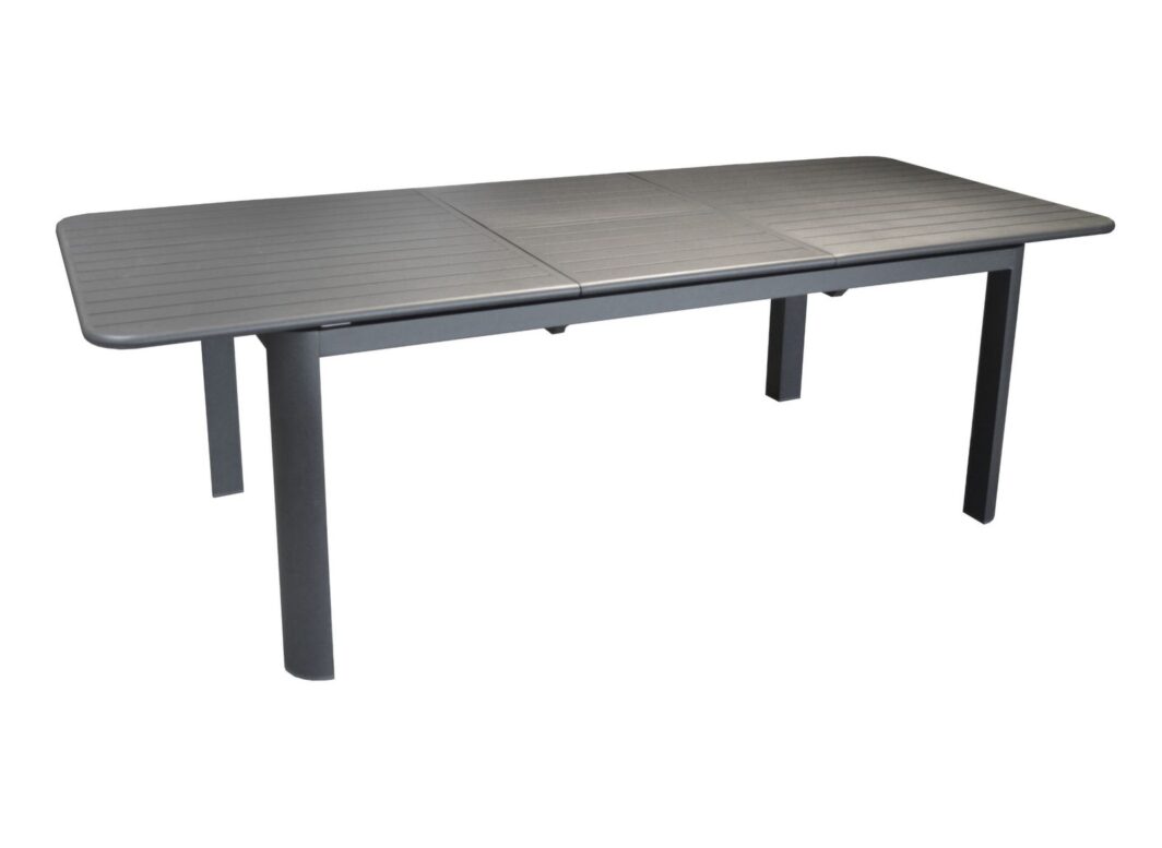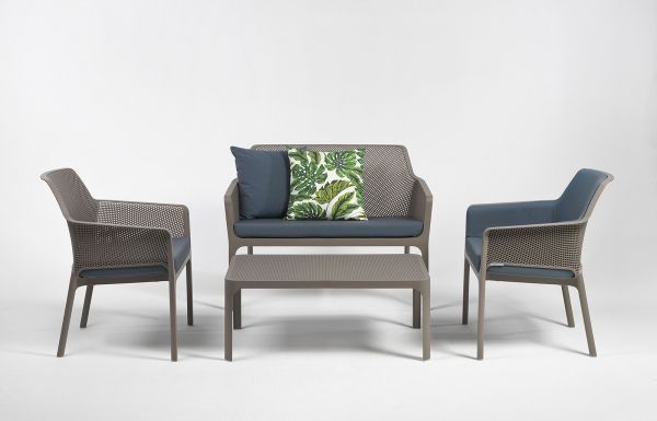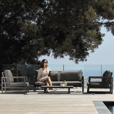 La seggiola slanciata suggerisce leggerezza e stabilità. Lo schienale è ottenuto curvando i tubolari in alluminio a sezione rettangolare ed è ricoperto di corda. Il cuscino è in textilene.