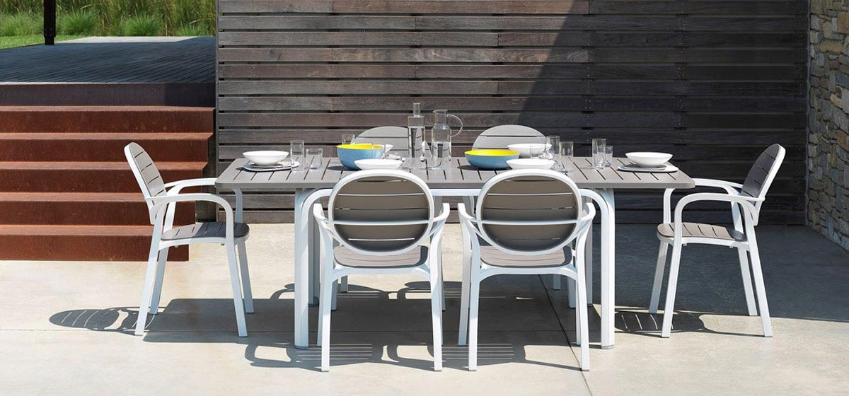 Caratteristiche tavolo: tavolo allungabile con piano in DurelTOP in polipropilene trattato anti-uv e colorato in massa, gambe in alluminio verniciato con piedini regolabili