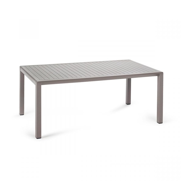 Tavolo Rio allungabile. Piano DurelTOP in polipropilene trattato anti-UV, colorato in massa. Gambe in alluminio verniciato. Finitura opaca. Dotato di piedini regolabili. 210 – 280 x 100 x 76h cm. Resina riciclabile.