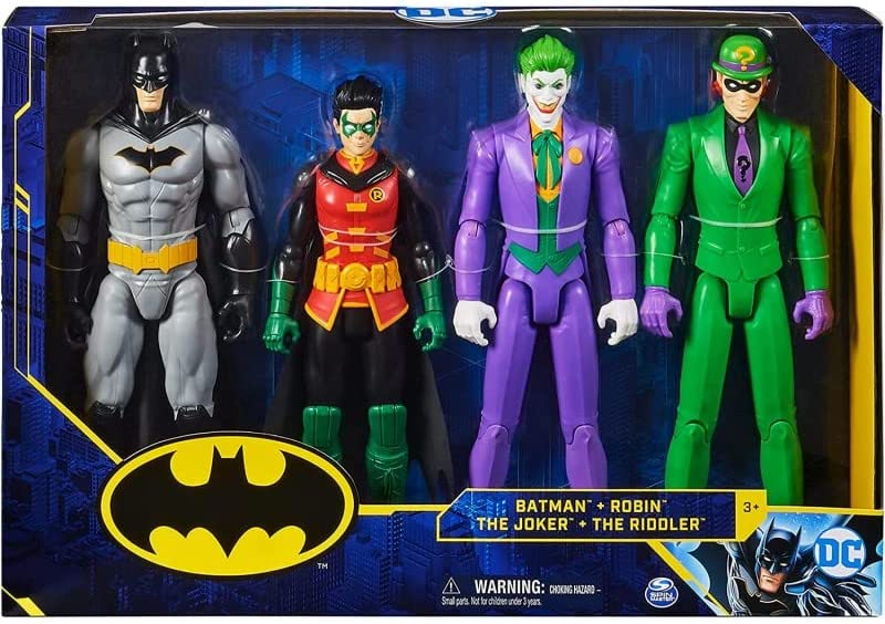 4 diversi personaggi da 30 cm dell’universo di Batman in una confezione: Batman, Robin, Joker e Enigmista