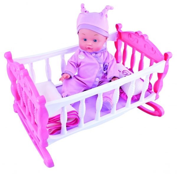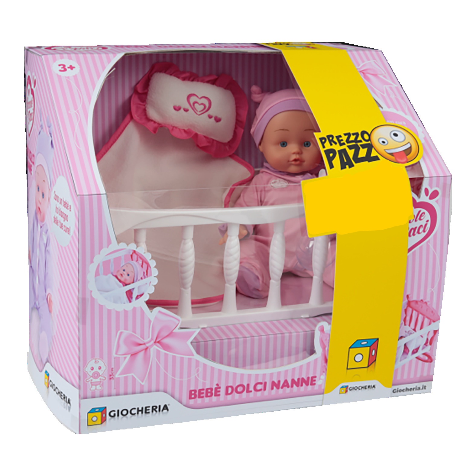 Dolce bambolotto con la sua culla. Copertina e cuscino inclusi.