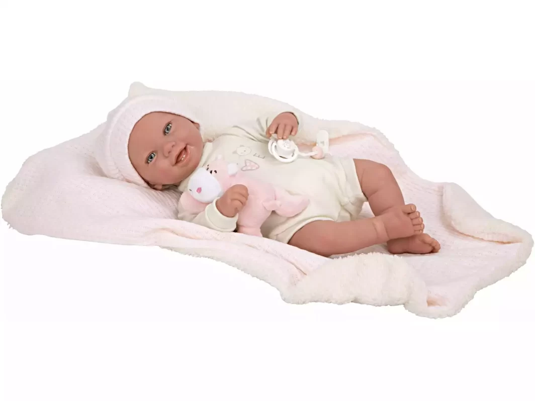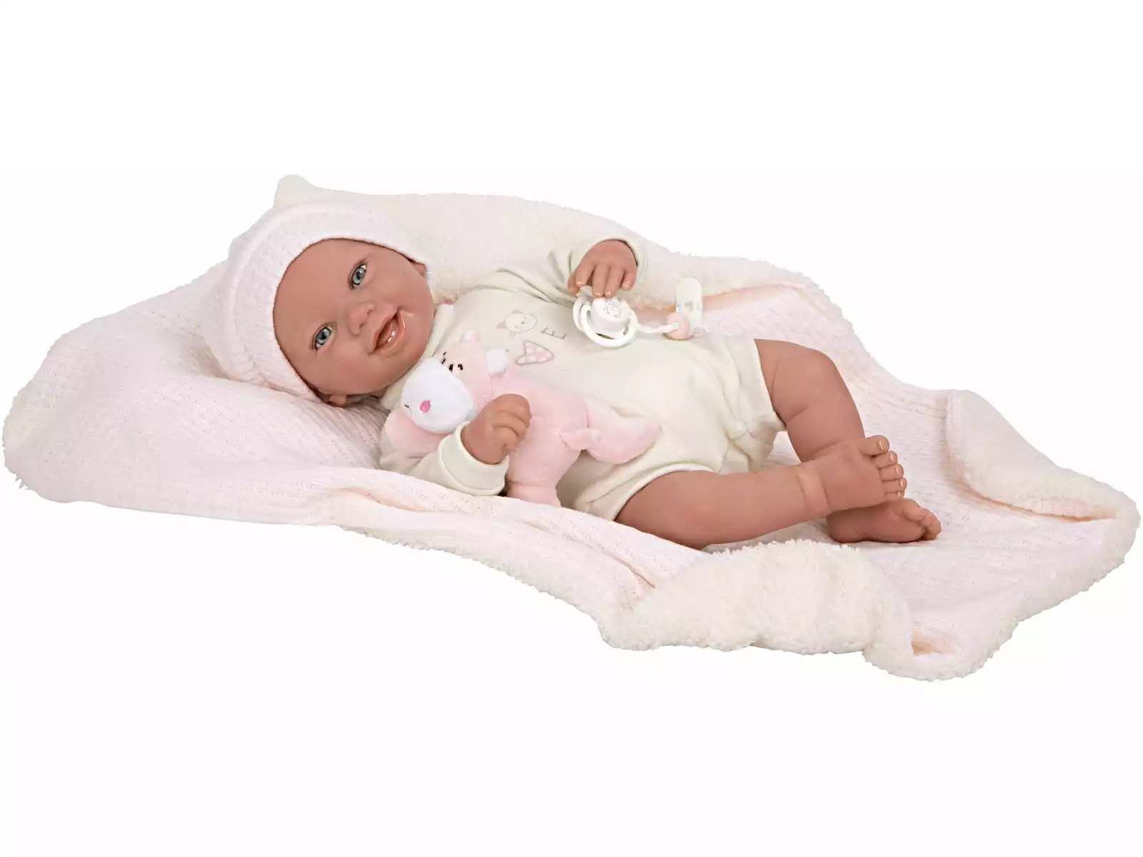 Bambola reborn 40 cm con espressione realistica, con corpo morbido e gambe e braccia in vinile. Indossa un elegante completo rosa e una deliziosa fascia in testa.