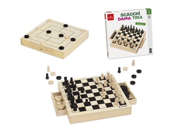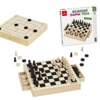 Pratico contenitore in legno con scacchiera per giocare a Scacchi e Dama, completo di due vani per pedine e pezzi per il gioco degli scacchi.