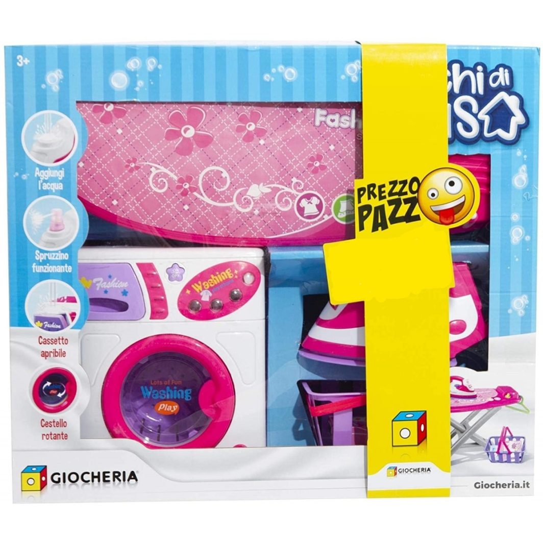Set completo di lavatrice con cestello rotante e cassettino apribile, ferro da stiro con spruzzino funzionante, asse da stiro e una cesta porta biancheria.