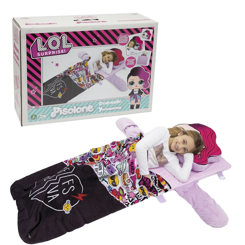 Il Pisolone L.O.L. riproduce fedelmente il personaggio Lol Rocker. Cuscino staccabile, nicchia per inserire le mani, due ampie aperture laterali per un facile accesso. La testa è un cuscino staccabile, e i materiali sono leggeri e lavabili. Si piega e si trasporta facilmente.