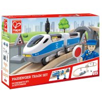 Insegna ai bambini i segnali di sicurezza con il tracciato ferroviario con figura a otto. Include un treno, un conducente, un passeggero e i segnali per fermare il treno e avviarlo nuovamente.