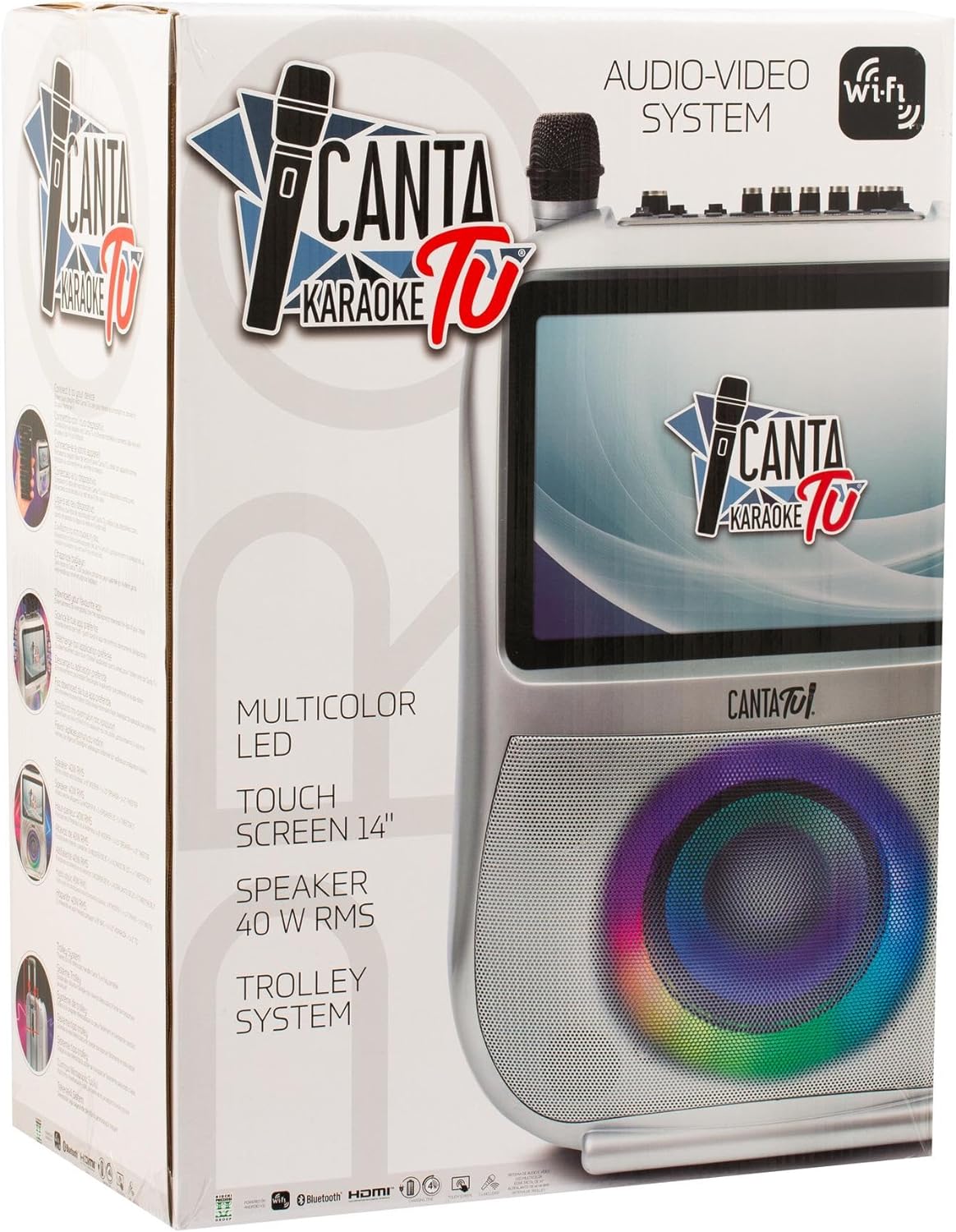 - RICCO DI FUNZIONALITÀ: wide display 14″ touch screen, effetto eco, voice Changer con divertenti effetti selezionabili da App, Luci a Led colorate in syncro con la musica, sound system potente