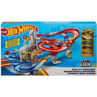 La pista è dotata di un elevatore motorizzato, rampe con ostacoli e 5 veicoli Hot Wheels City.
