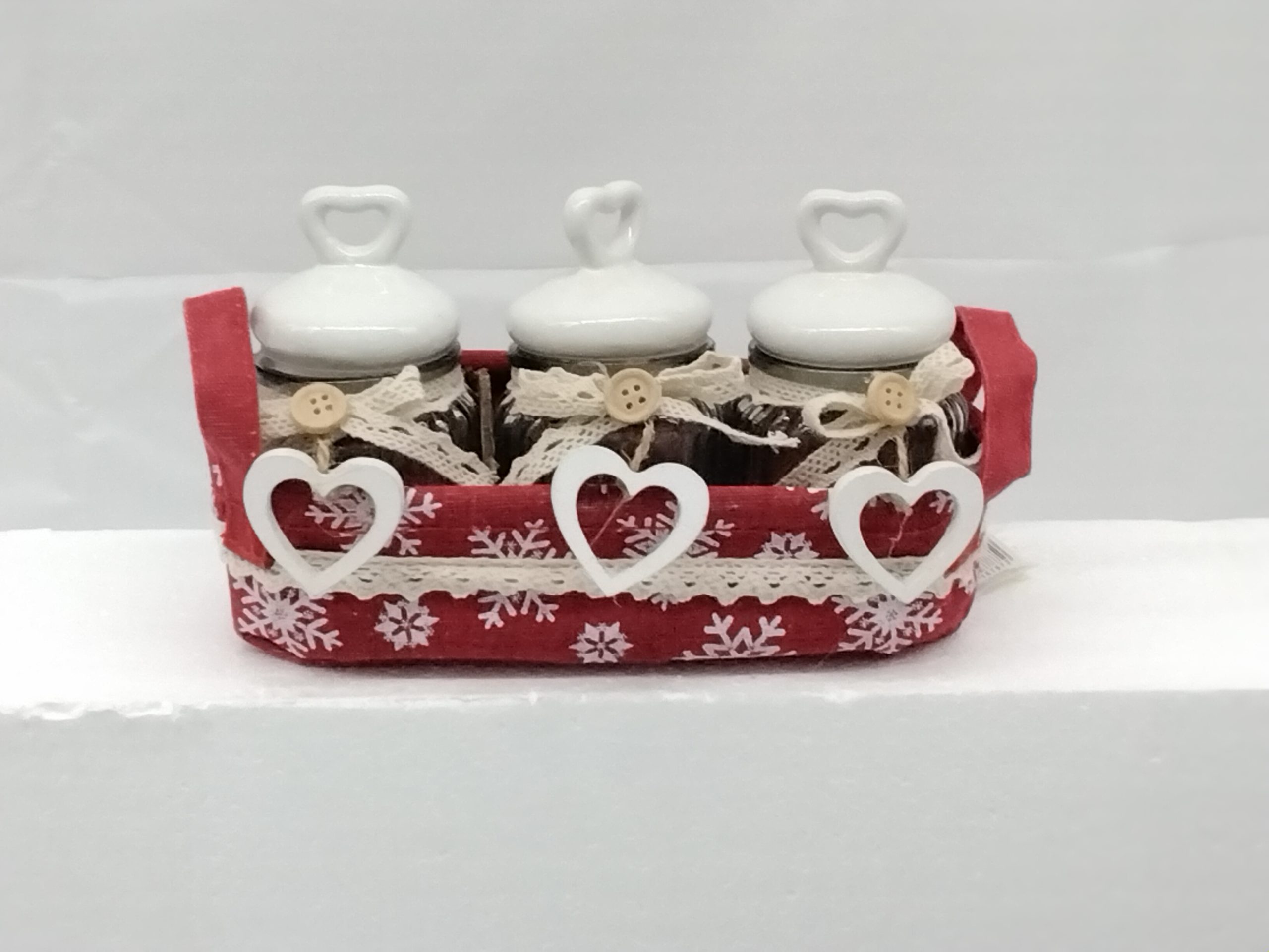 3 vasetti in vetro con vassoio rosso.